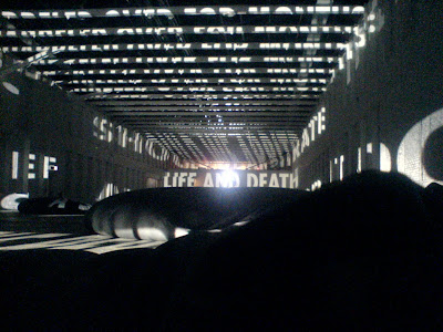 A projection installation by Jenny Hoolzer, at Mass Moca in 2008, of a poem by Wislawa Szymborska. It was set in a stadium size rooms dotted with bean bags. While you lounged in those bean bags, the projections would dangling across the entire length of the room. It's like watching constellations of lullabies and words while lying in bed.